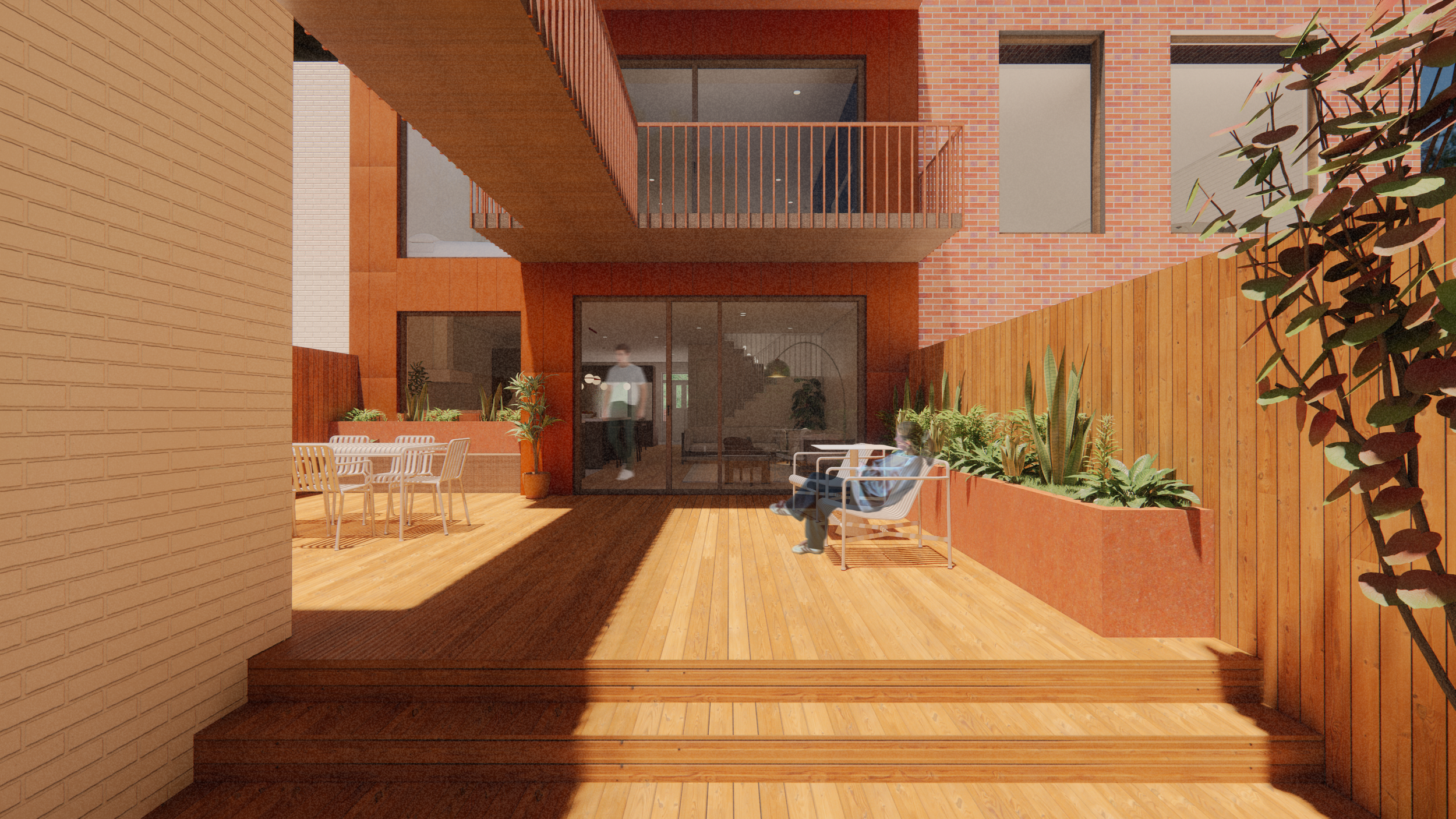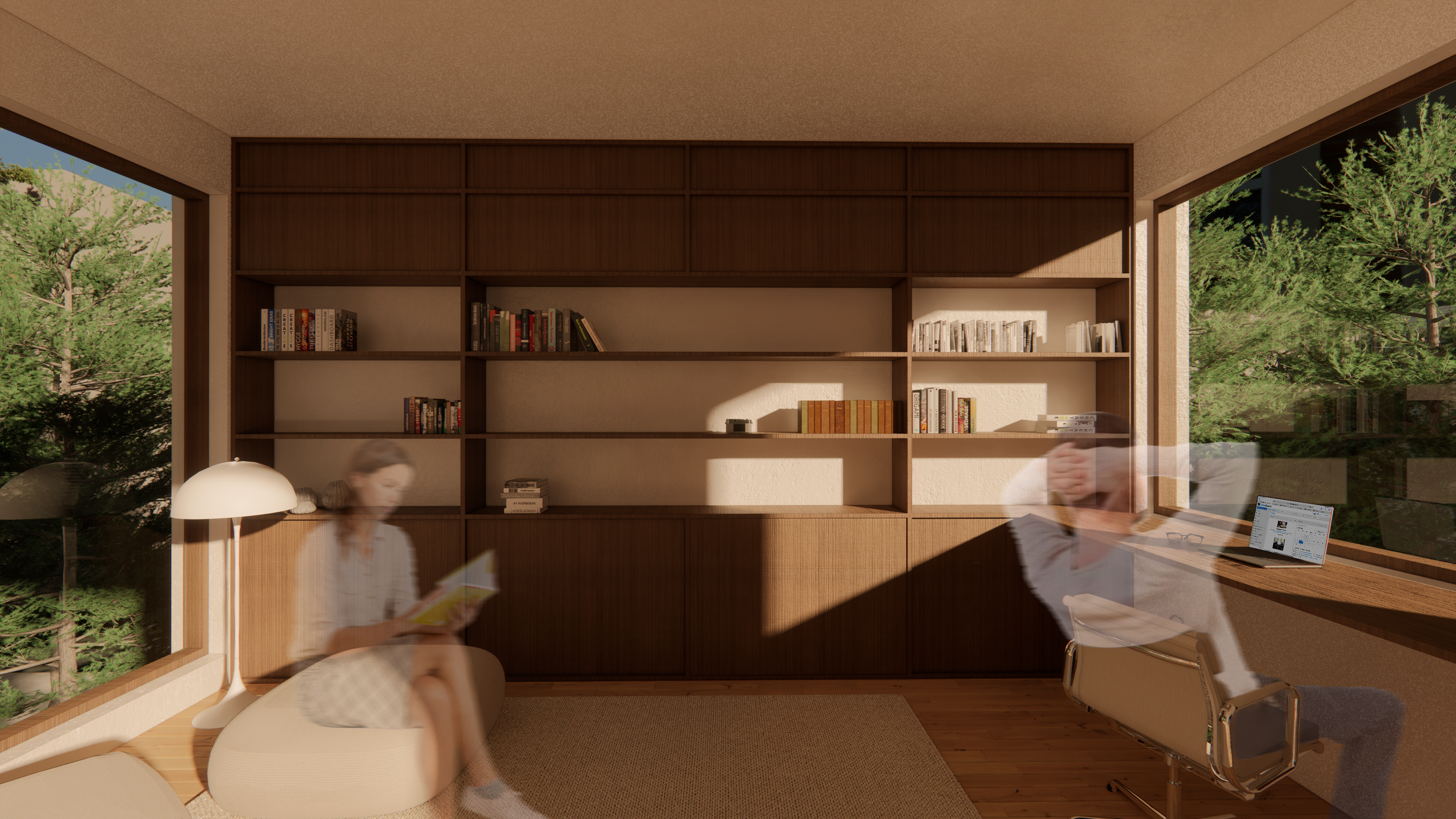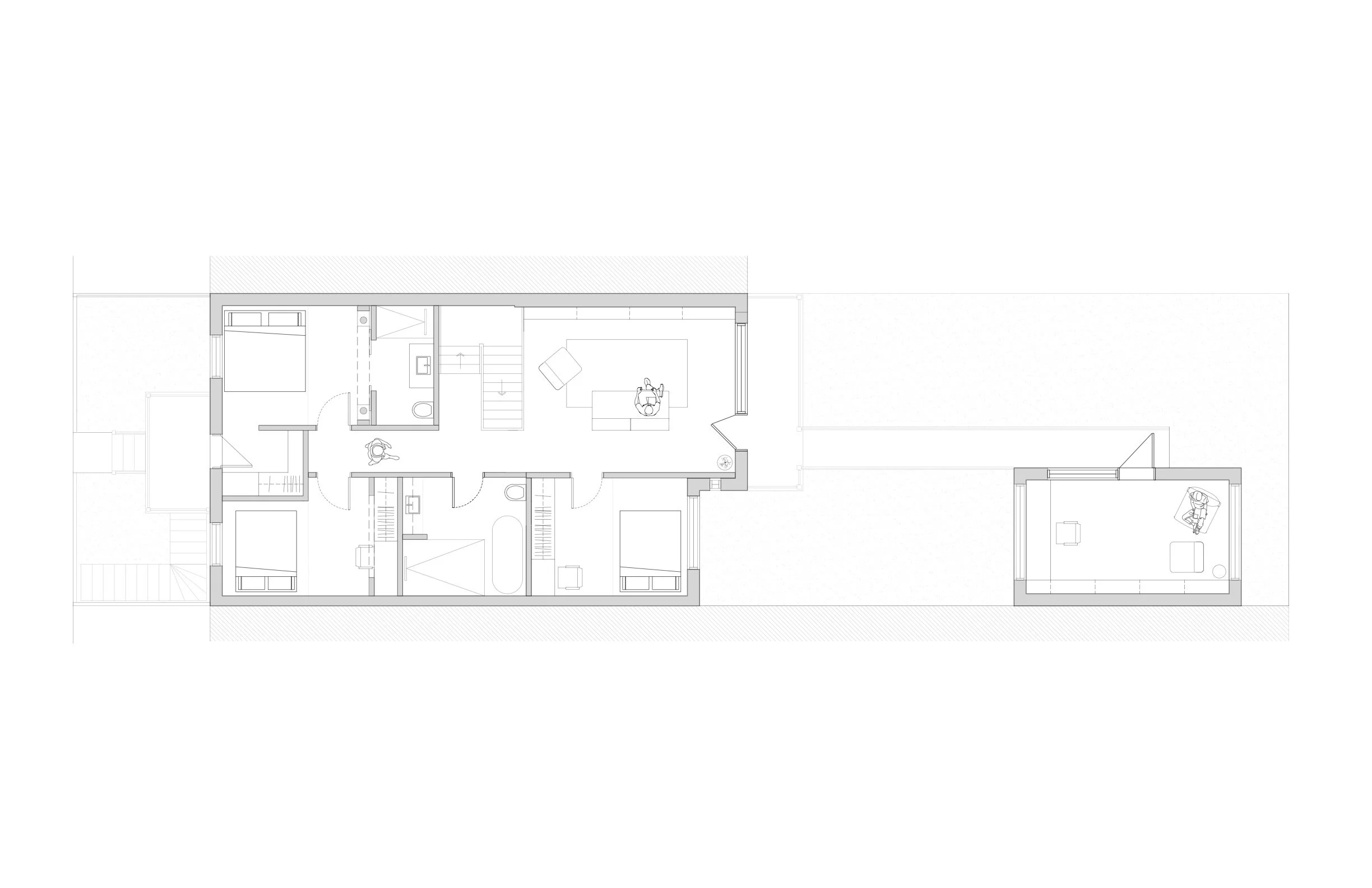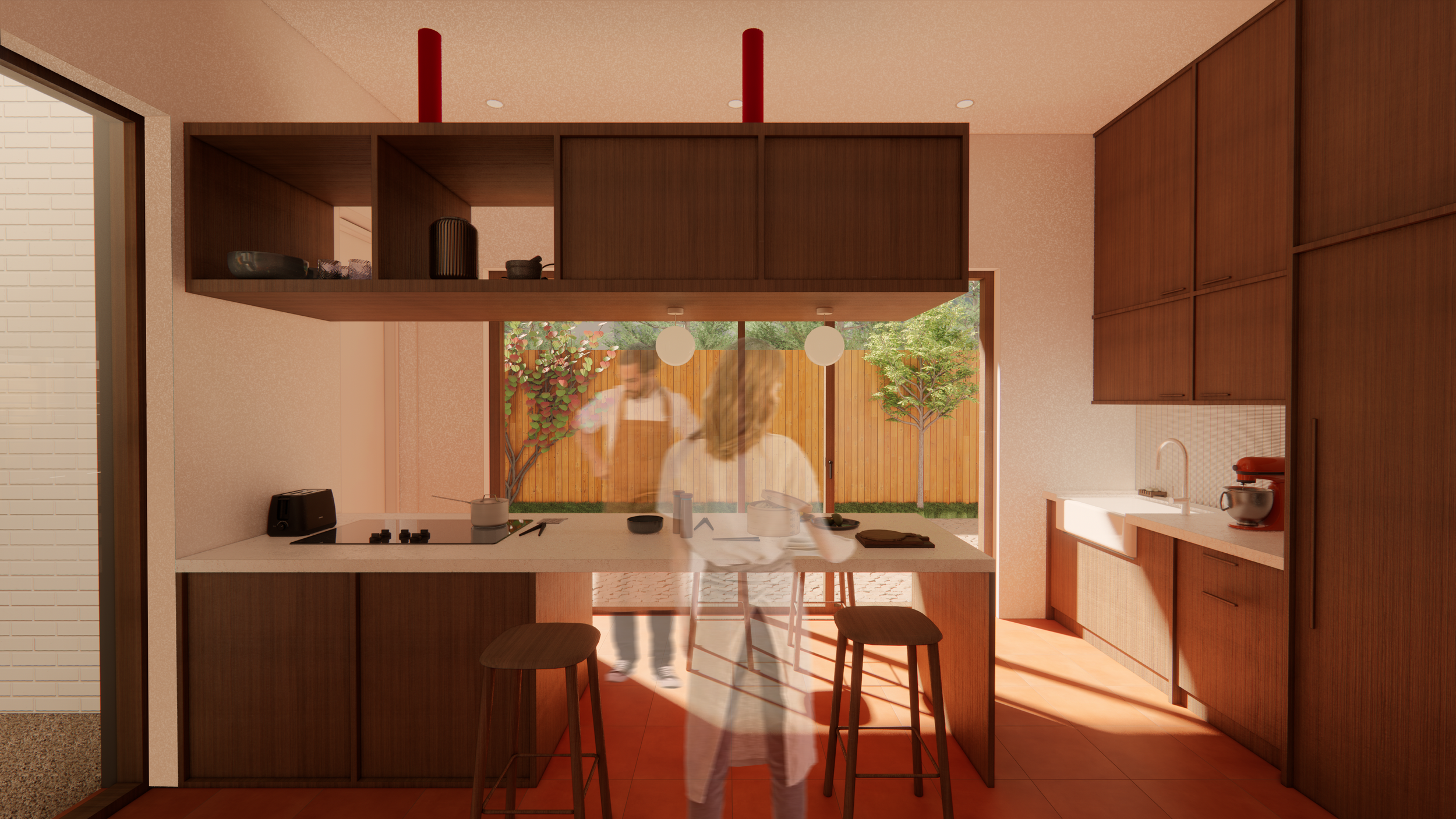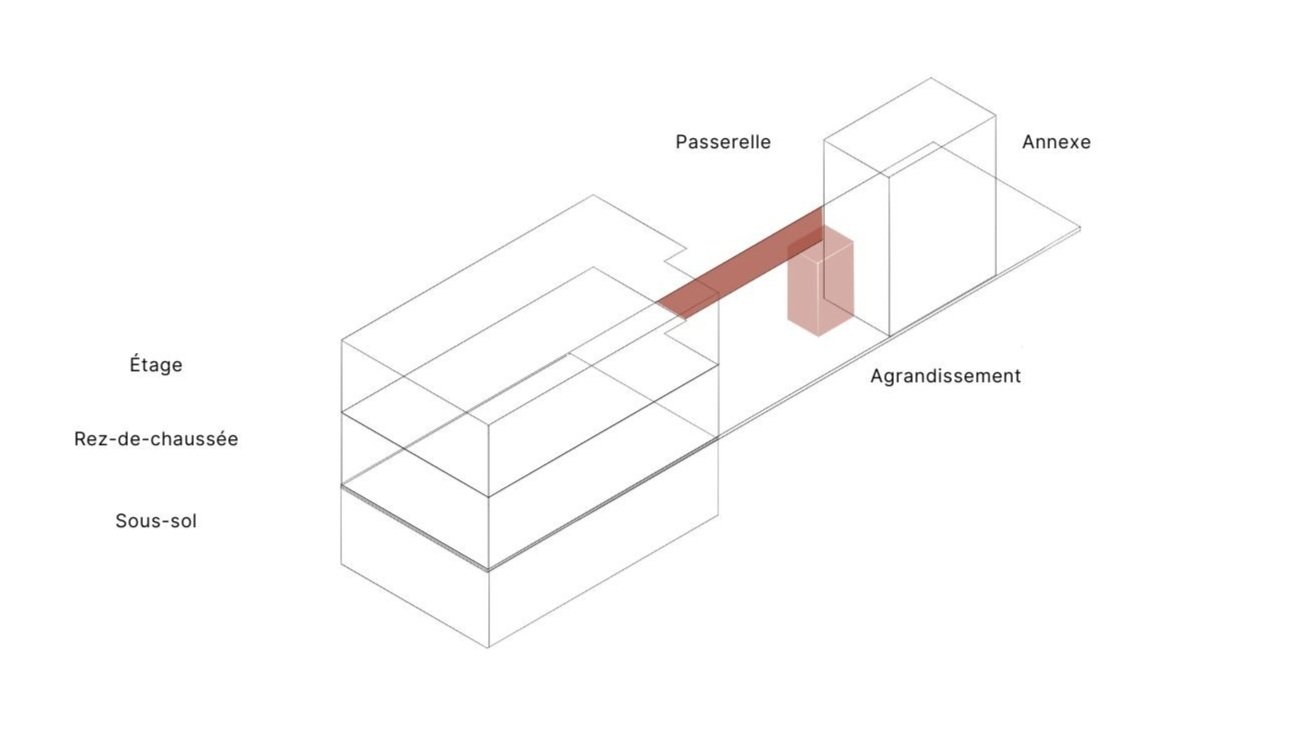 En ce qui concerne les besoins de la famille, le père dispose d’un espace de travail réfléchi et agencé pour répondre à tous ses besoins. La mère quant à elle aura à disposition une cuisine secondaire dans l’annexe afin d'y donner ses cours en toute intimité. L’isolement de cette cuisine permet la venue des clients sans impacter la vie familiale puisqu'ils peuvent y accéder par la ruelle arrière. Une terrasse permet de délimiter l’espace entre la partie familiale et la partie publique.