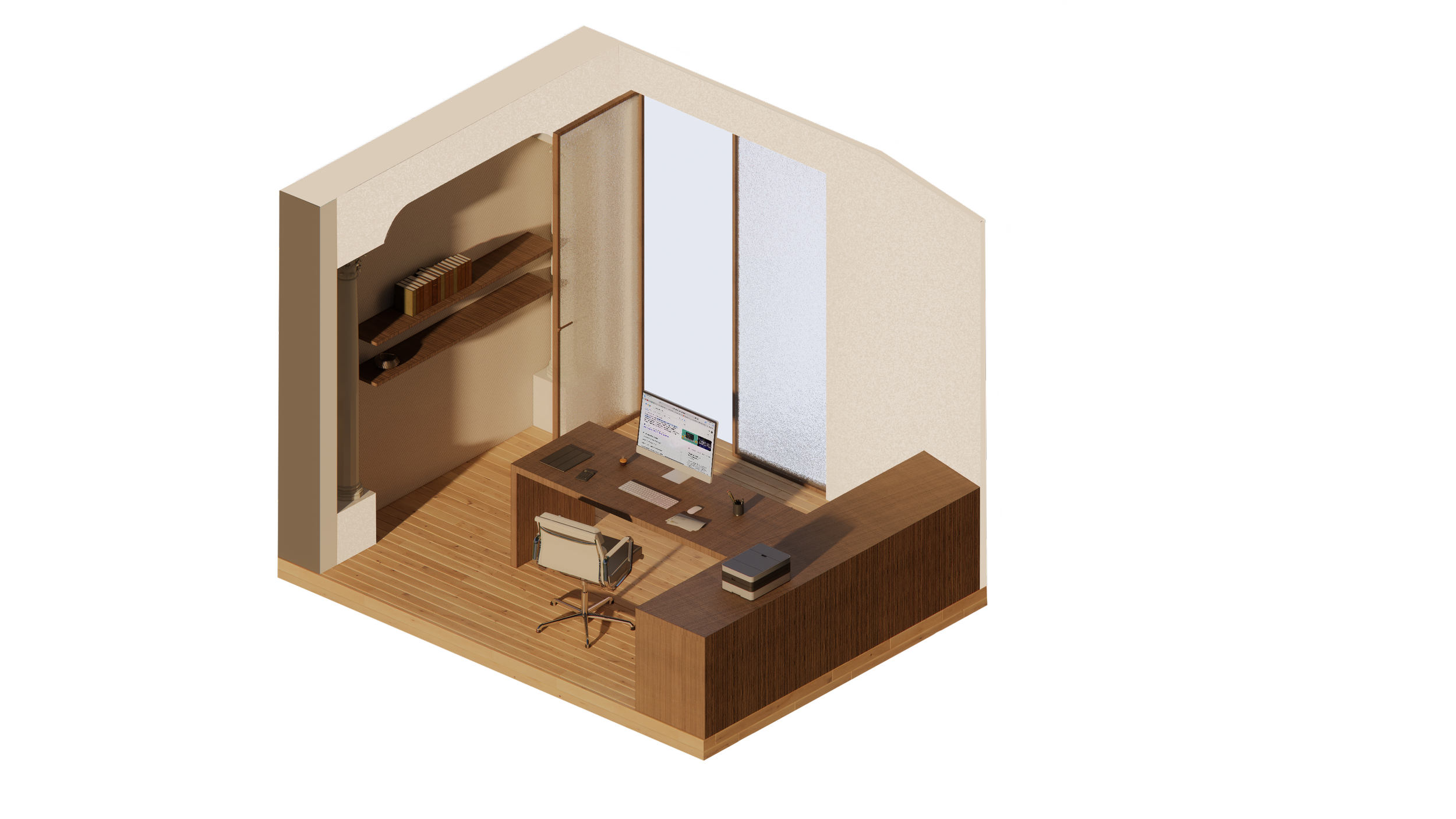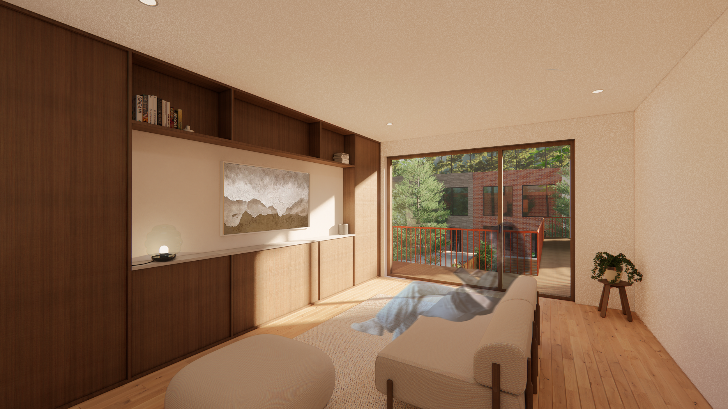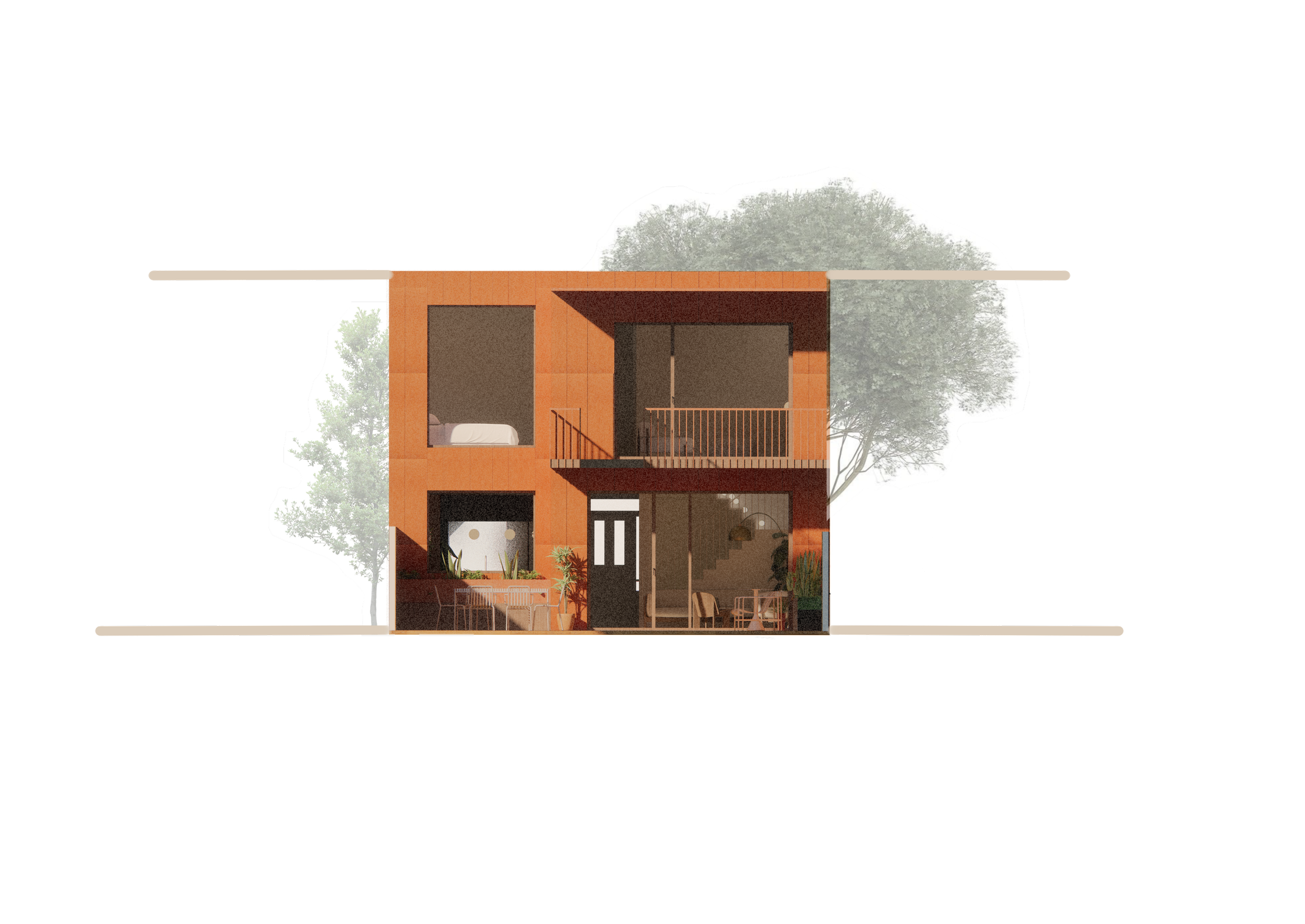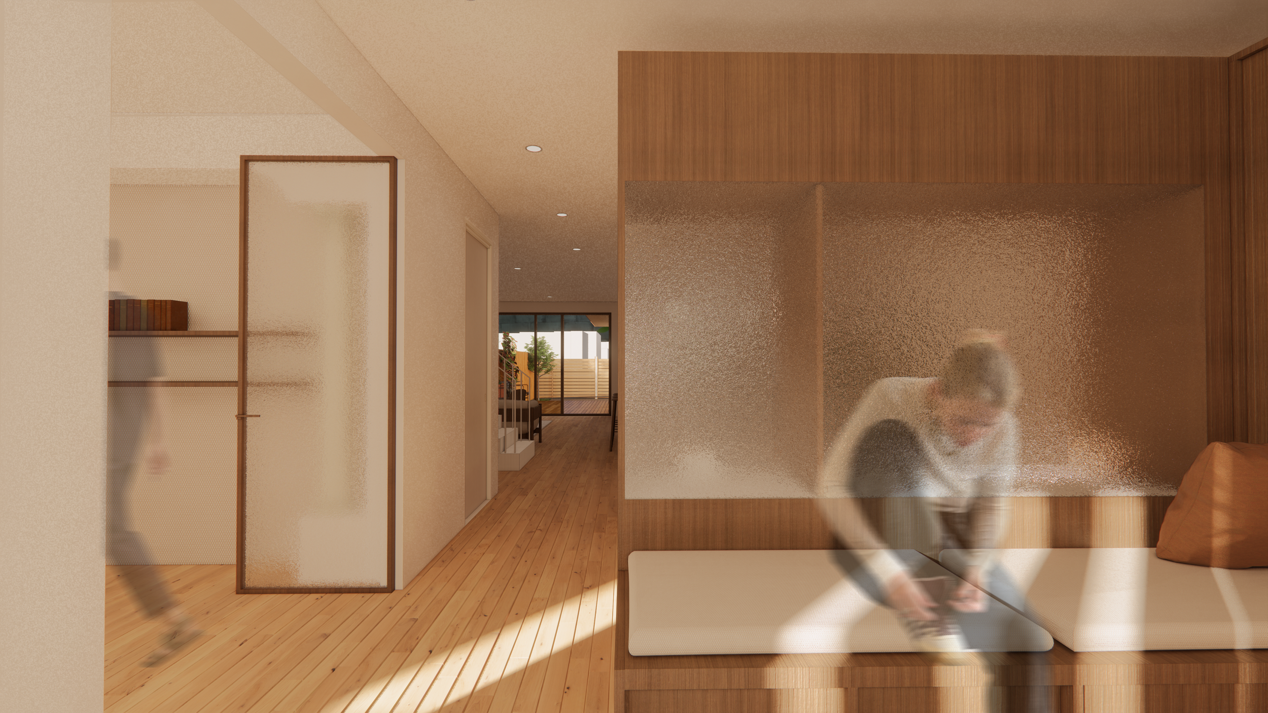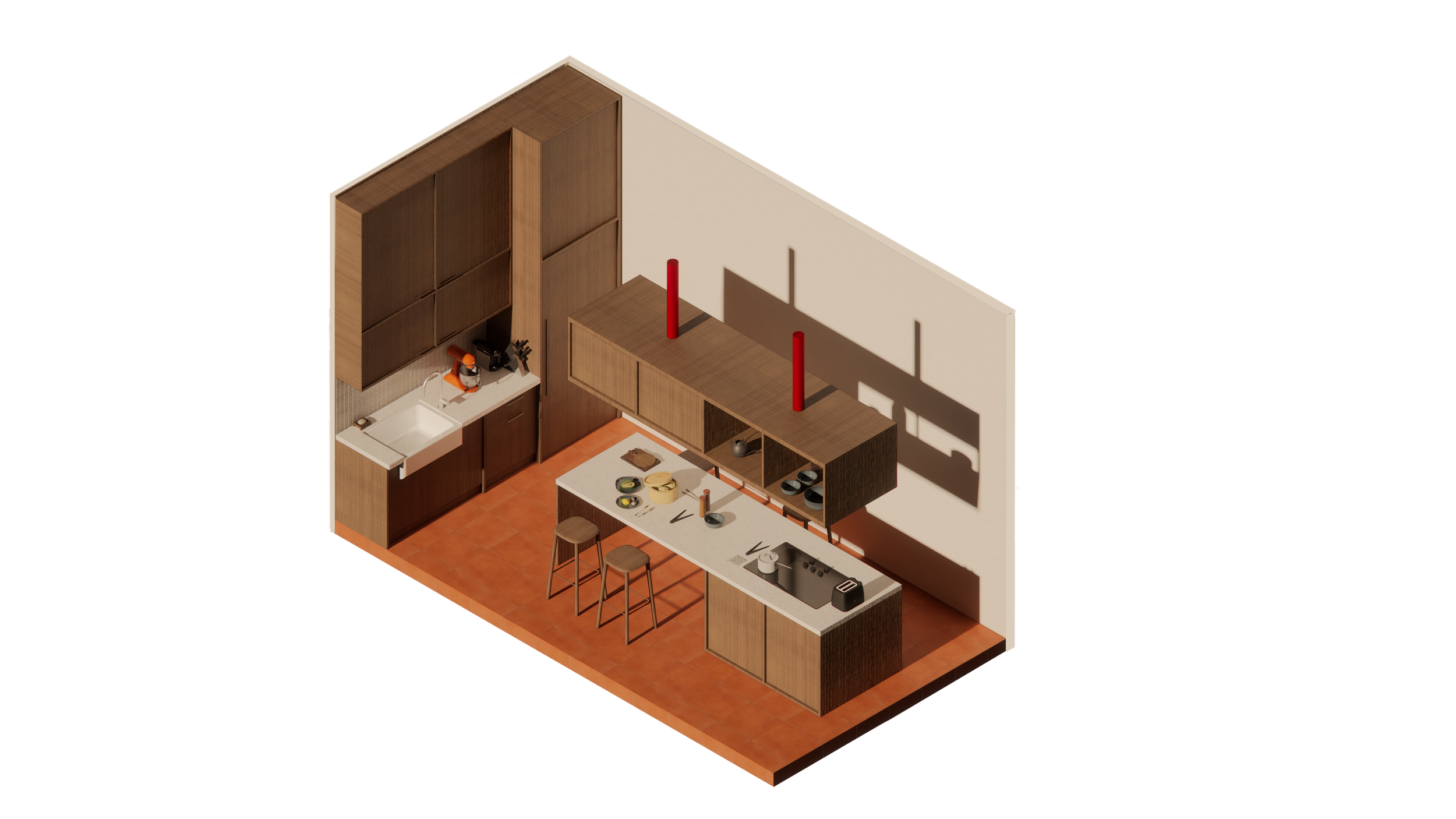 En ce qui concerne les besoins de la famille, le père dispose d’un espace de travail réfléchi et agencé pour répondre à tous ses besoins. La mère quant à elle aura à disposition une cuisine secondaire dans l’annexe afin d'y donner ses cours en toute intimité. L’isolement de cette cuisine permet la venue des clients sans impacter la vie familiale puisqu'ils peuvent y accéder par la ruelle arrière. Une terrasse permet de délimiter l’espace entre la partie familiale et la partie publique.