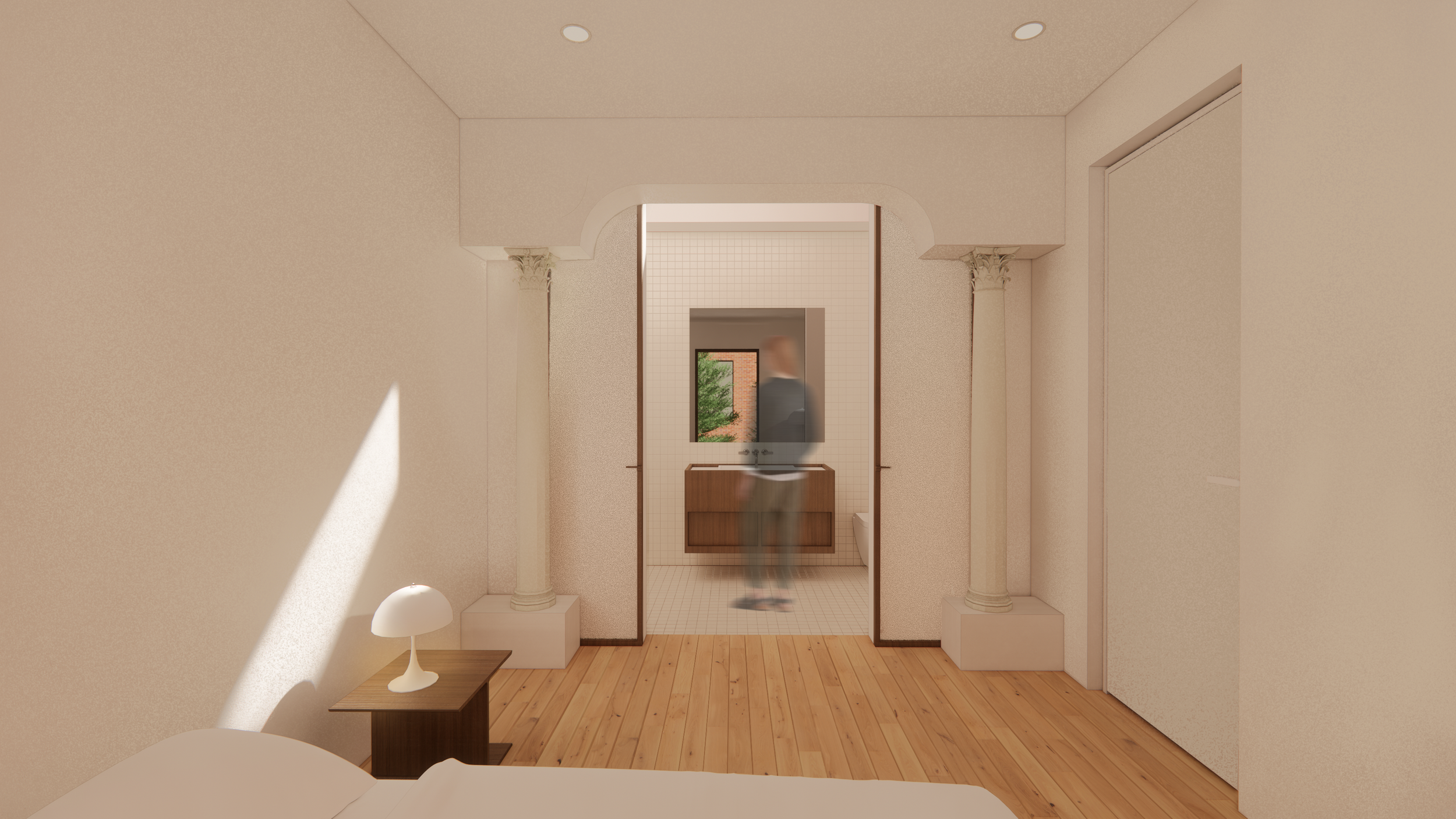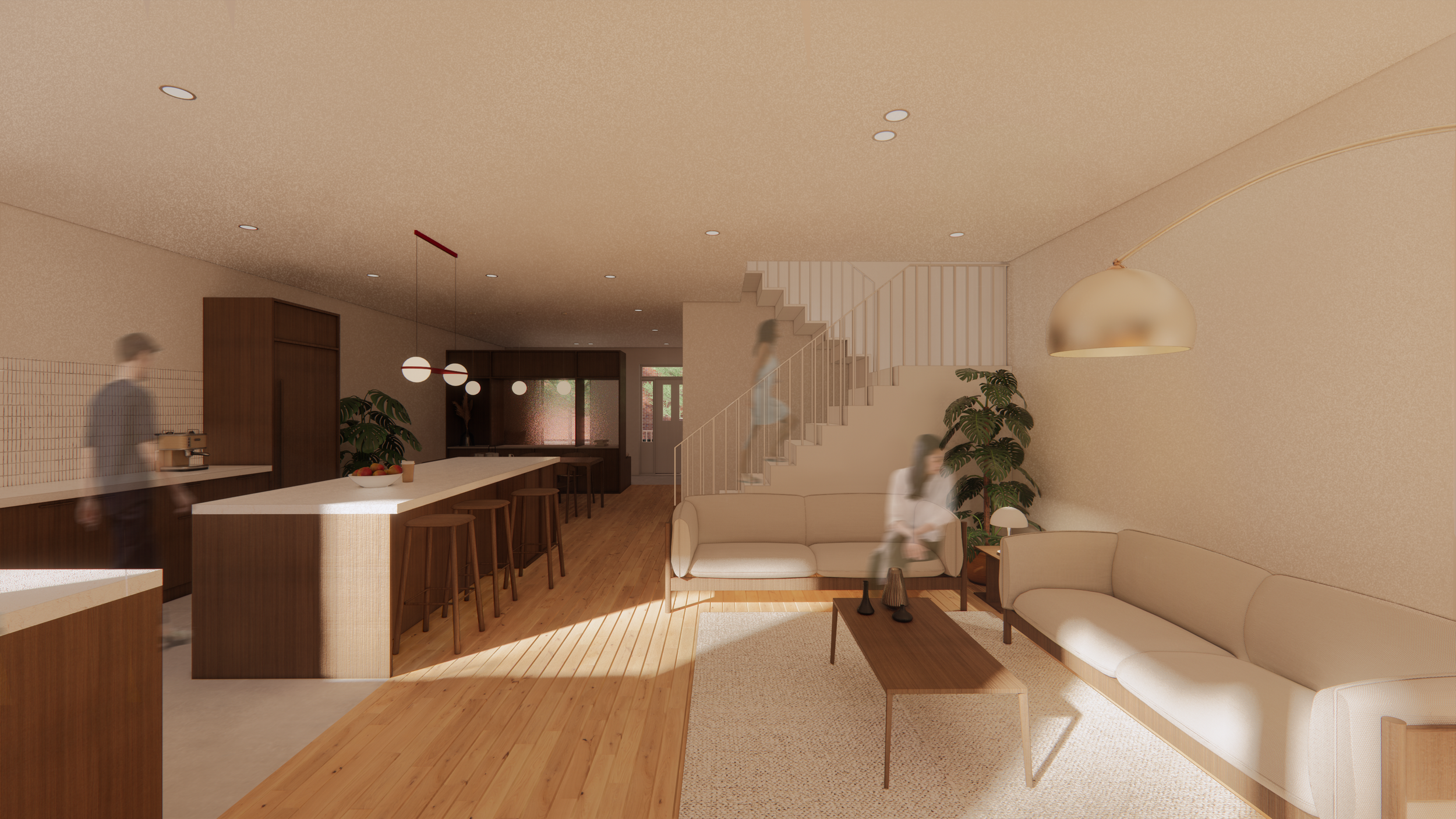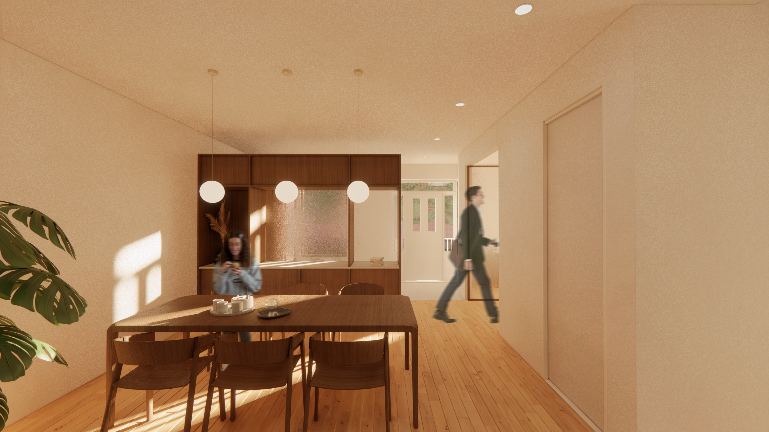 À travers cet aménagement, l’idée est de mettre en valeur les détails originaux déjà présents comme les escaliers extérieurs, les colonnes, les cadres de portes en bois ou encore le couloir. Toutes ces caractéristiques qui font l'âme de ce plex ont été intégrées au projet tout en répondant aux besoins de la famille. De plus, le couloir est gardé en tant qu’élément central autour duquel les espaces de vie vont s'articuler. Au rez-de-chaussée , on retrouve son empreinte grâce au travail du meuble sur mesure de l’entrée, à l'aménagement de la salle à manger et de la cuisine, et du sol qui tous réinterprètent les murs originaux. Ces aménagements délimitent l’effet du couloir dans la longueur qui est présent sans être réellement défini.