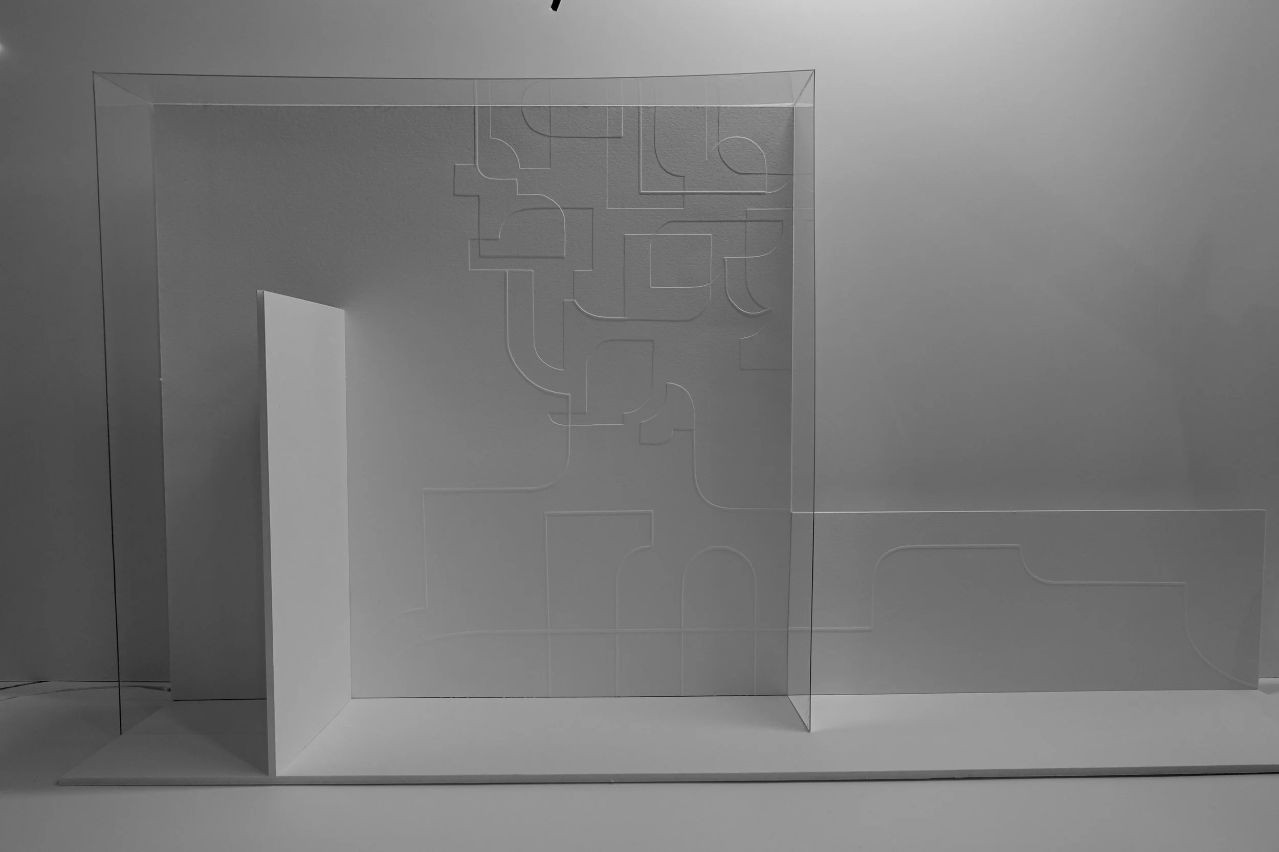 Cette surface devait être envisagée comme un vaste bas-relief composé de figures abstraites. Cette recherche propose d'étudier la dimension tactile, lumineuse et esthétique de la surface d’un mur.
